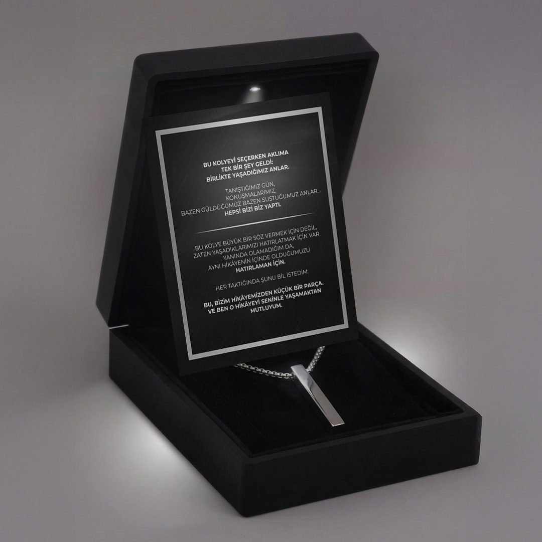 Her kargo kutusunda kolyenin yanı sıra, özel mesaj kartı, bakım önerileri, teşekkürler kartı ve anlamlı bir sunum yer alır.