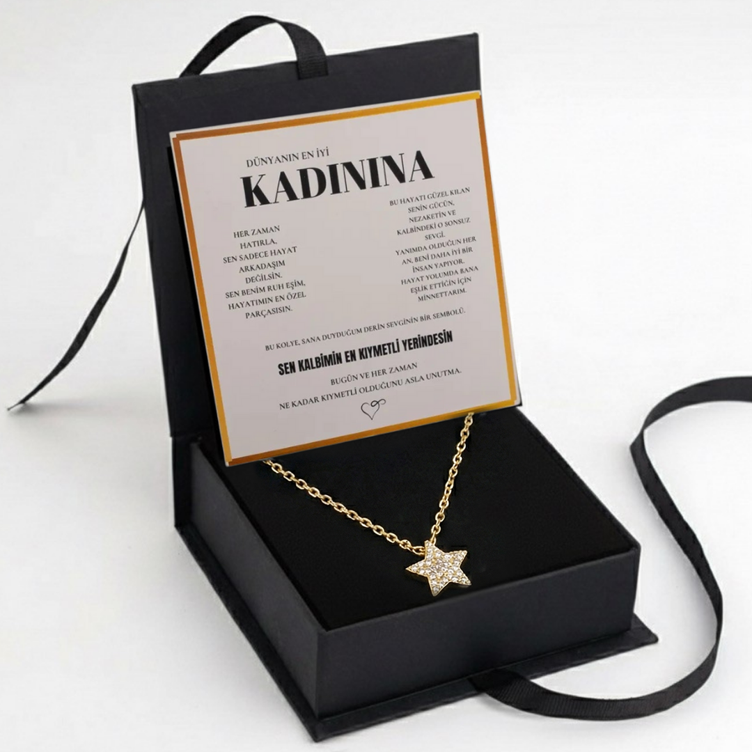"Kadınına" Elmas İşlemeli Star Kolye Anlamlı Not ve Kutulu