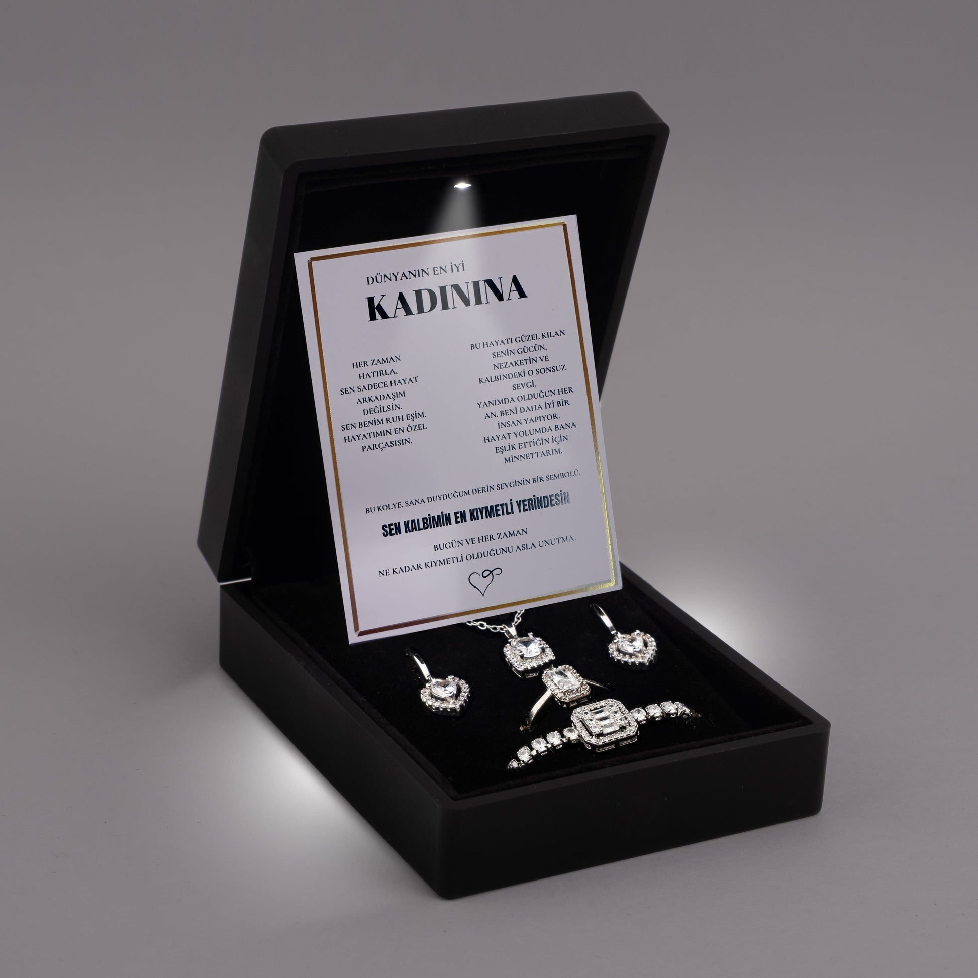 Her kargo kutusunda kolyenin yanı sıra, özel mesaj kartı, bakım önerileri, teşekkürler kartı ve anlamlı bir sunum yer alır.