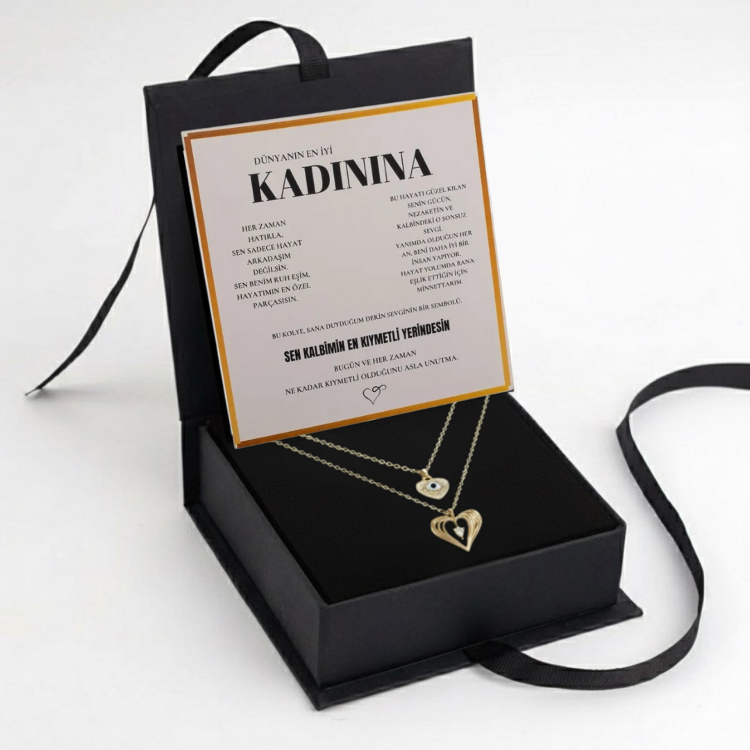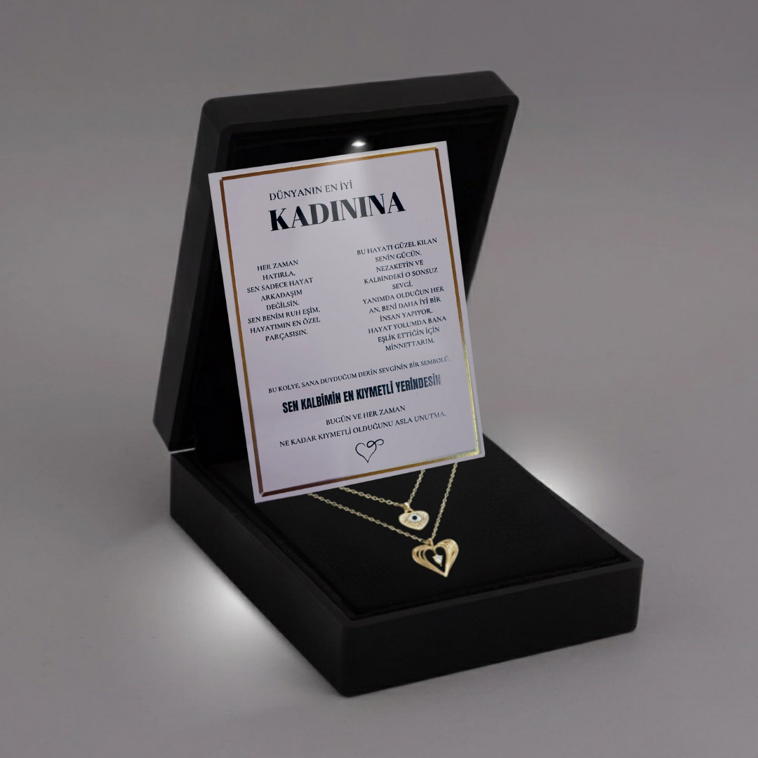 "Kadınına" Çift Kalp Kolye Anlamlı Not ve Kutulu