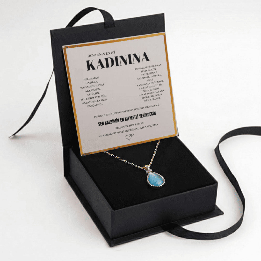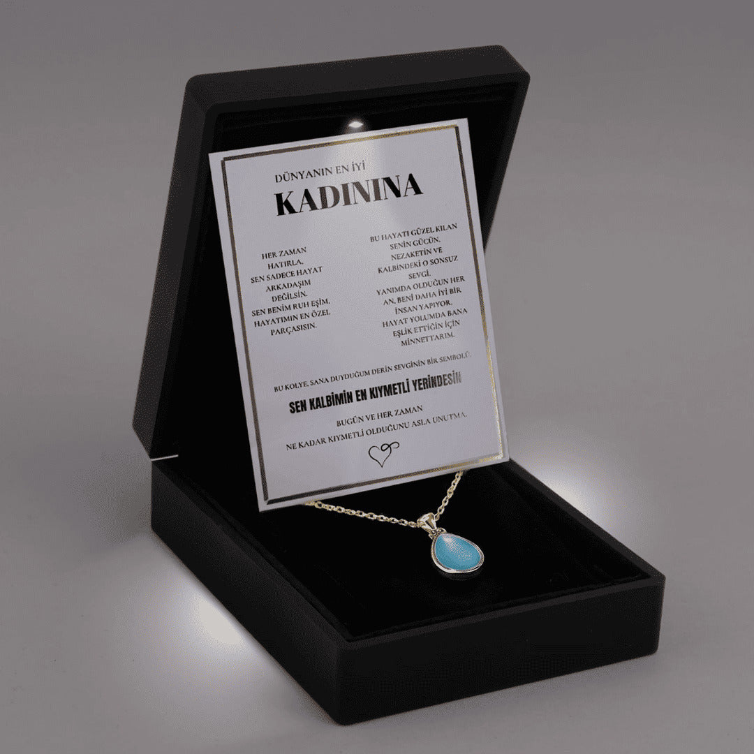 "Kadınına" Deniz Mavisi Doğal Taşlı Damla Kolye Anlamlı Not ve Kutulu