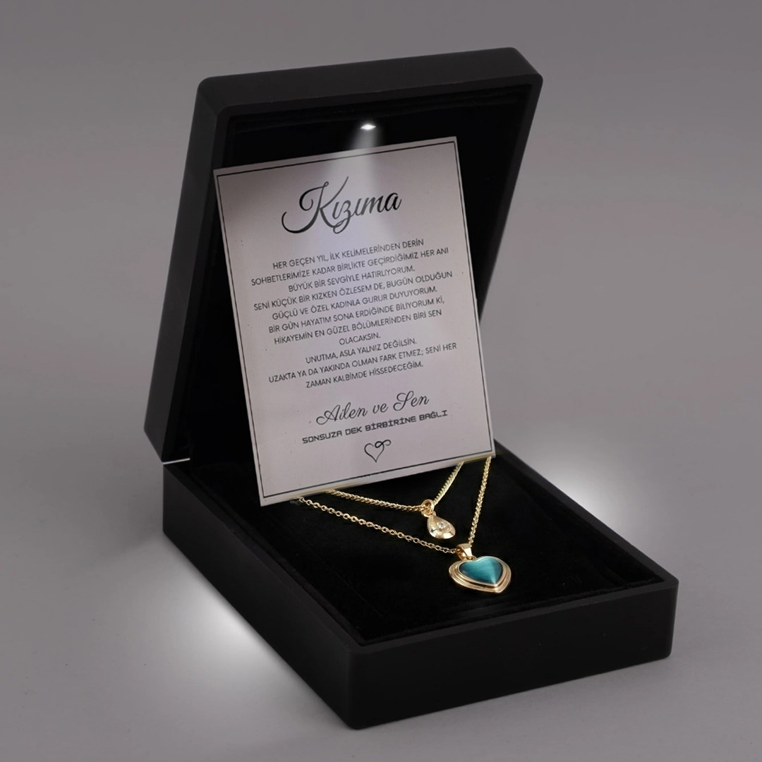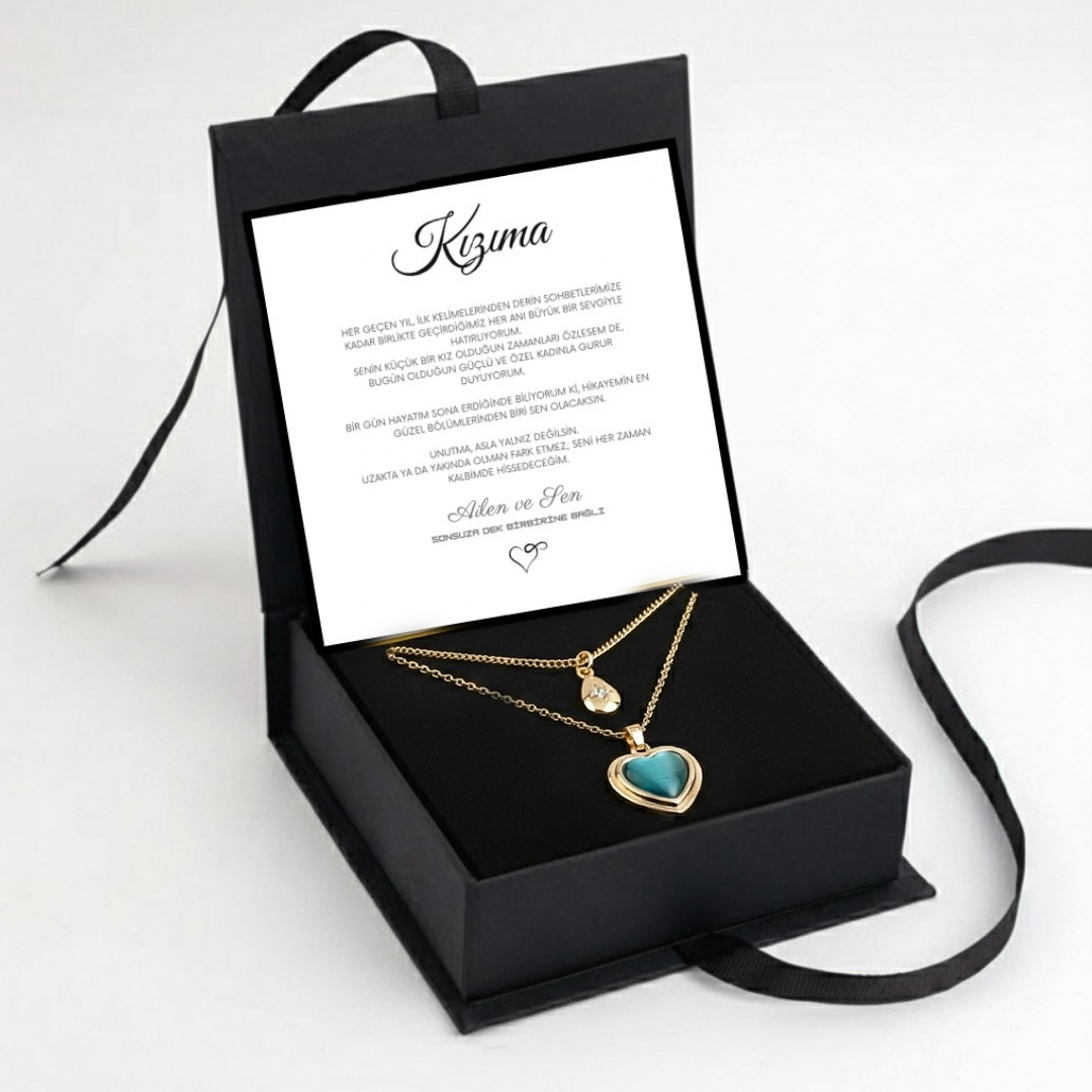 "Kızıma" Deniz Mavisi İkili Kalp Kolye Anlamlı Not ve Kutulu