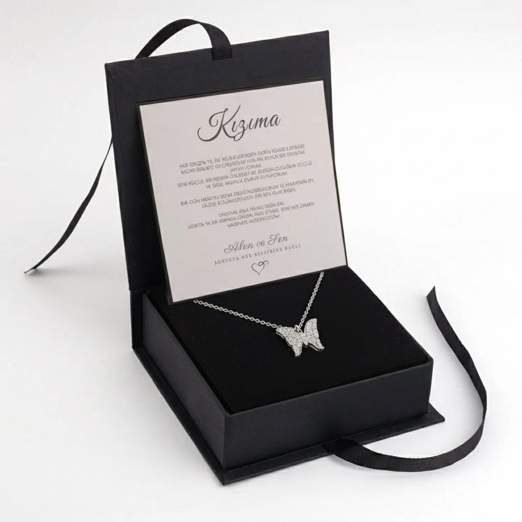 ''Kızıma'' Işıltılı Kelebek Kolye Anlamlı Notlu ve Kutulu